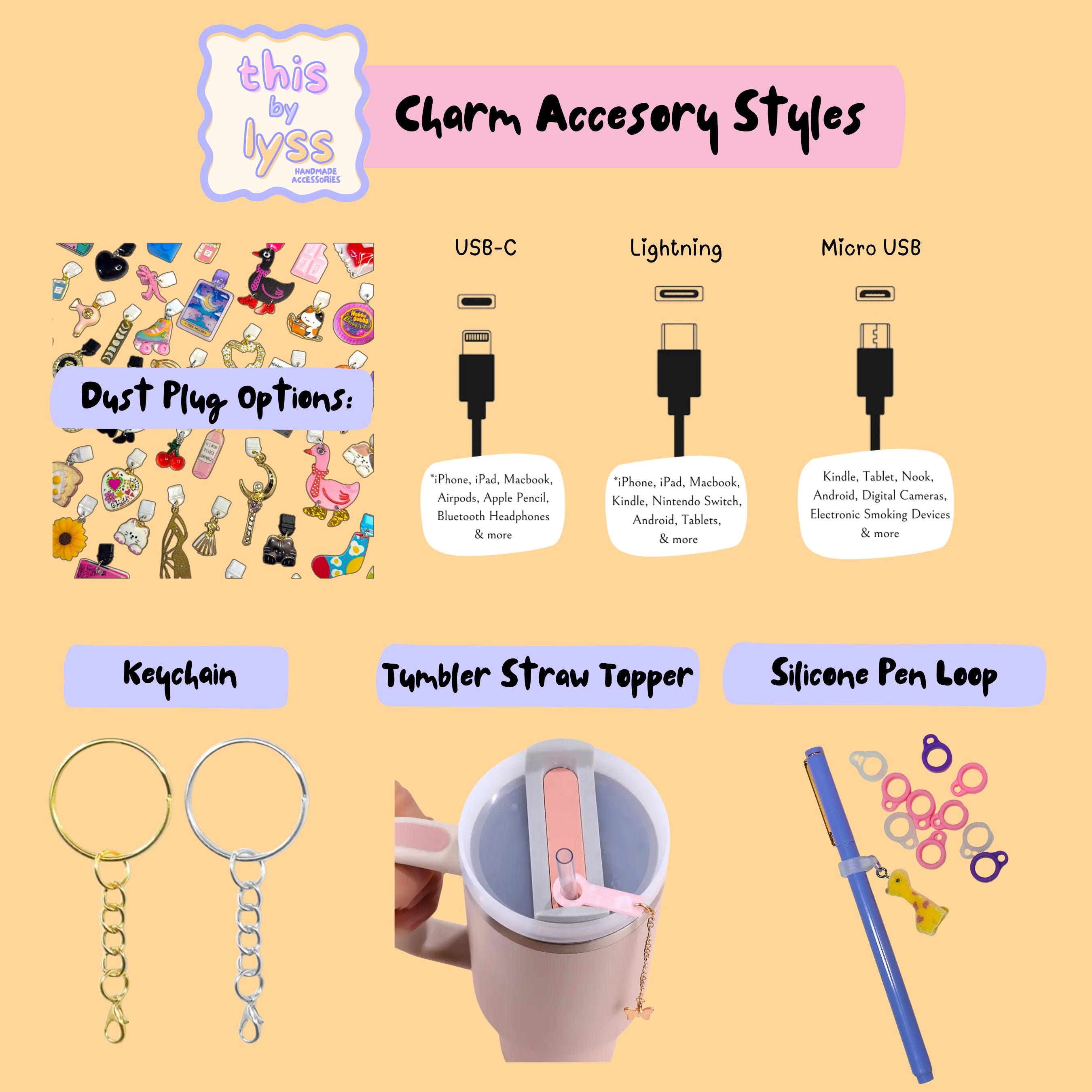 –Colored dust plug options are available for USB-C and Lightning charms. If you have a preference, please specify in the notes section of your order. I will always do my best to fulfill requests to the best of my ability, although there is no guarantee.